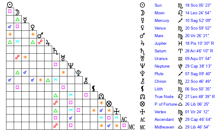 Sun | 18 Scorpio 6 | 18 Scorpio 48 | 14 Sagittarius 22 |