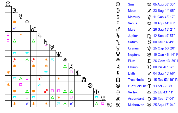 Sun | 5 Aquarius 39 | 7 Aquarius 0 | 28 Taurus 33 |