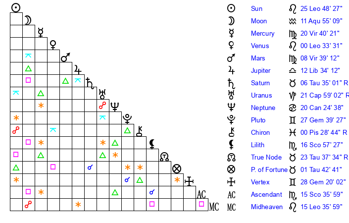 | Moon | 11 Aquarius 56 | 12 Cancer 33 | 27 Aries 37 |