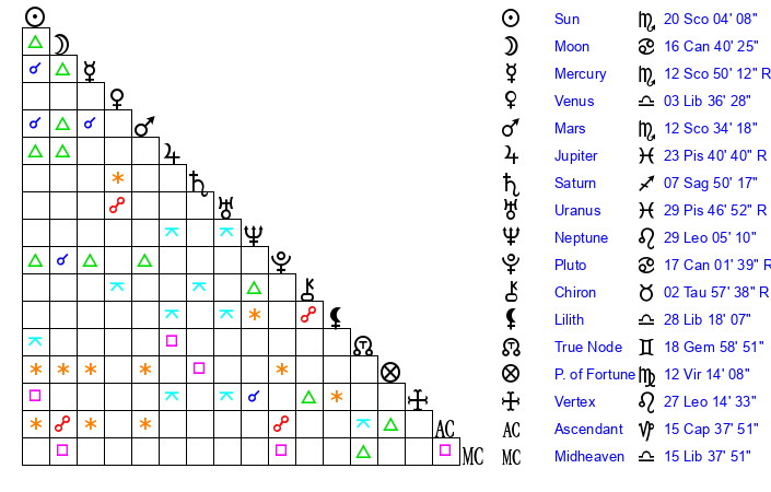 | Sun | 20 Scorpio 4 | 21 Scorpio 19 | 29 Aquarius 34 |