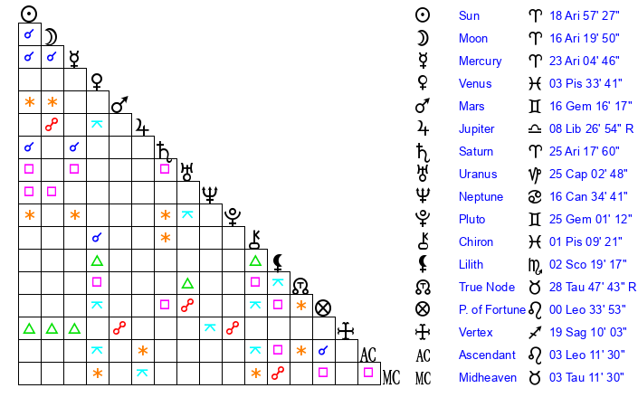 | Sun | 18 Aries 58 | 20 Aries 5 | 9 Leo 29 |
