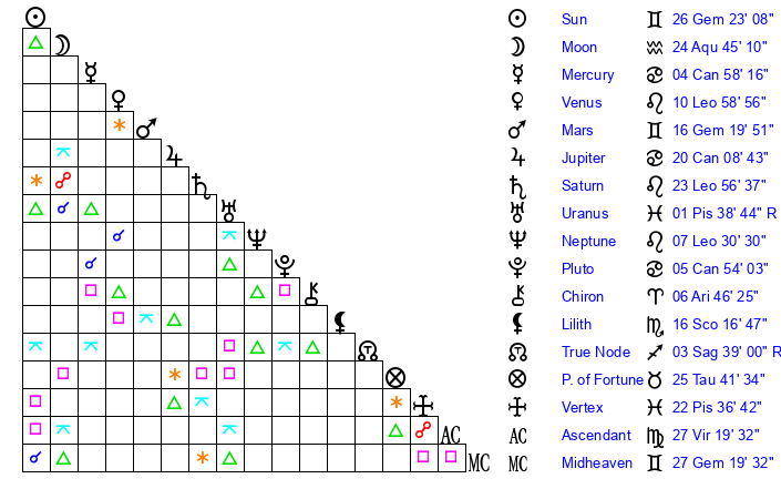 | Sun | 26 Gemini 23 | 27 Gemini 42 | 8 Libra 26 |