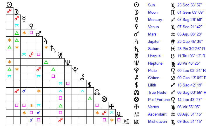 | Moon | 1 Gemini 0 | 9 Scorpio 28 | 25 Leo 20 |