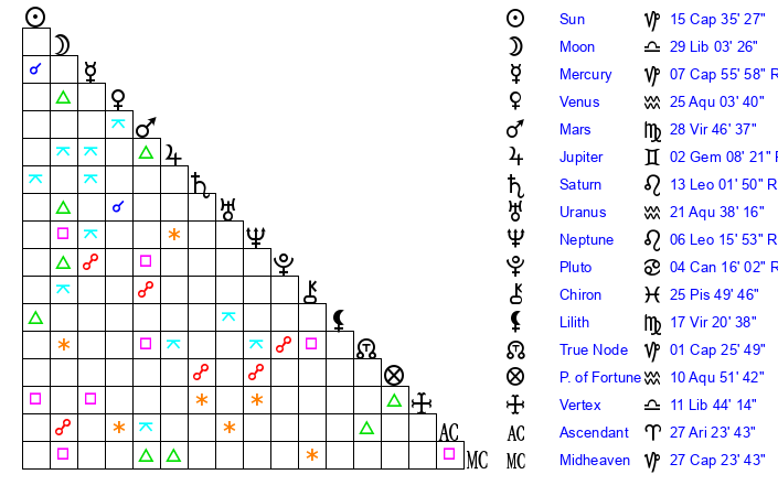 | Mars | 28 Virgo 46 | 29 Cancer 54 | 13 Virgo 52 |