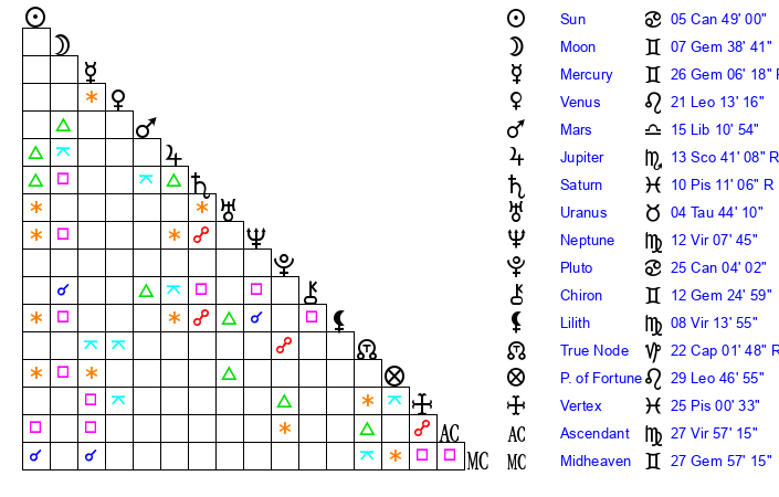 | Mercury | 26 Gemini 6 | 2 Leo 7 | 28 Libra 20 |