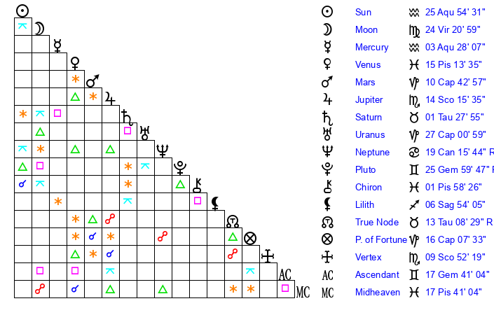 Sun | 25 Aquarius 55 | 27 Aquarius 16 | 17 Gemini 43 |