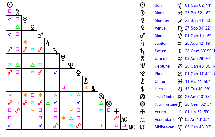 | Mercury | 23 Sagittarius 42 | 10 Sagittarius 29 | 3 Aries 11 |