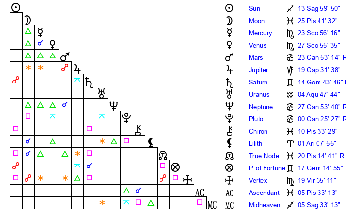 | Sun | 13 Sagittarius 59 | 14 Sagittarius 49 | 7 Aries 10 |