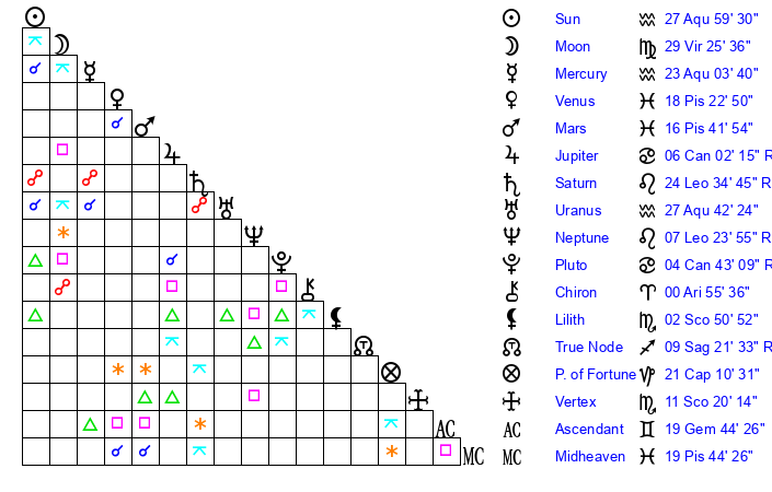 | Sun | 27 Aquarius 59 | 29 Aquarius 17 | 12 Gemini 3 |