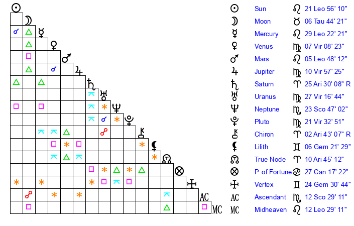 Sun | 21 Leo 56 | 22 Leo 9 | 17 Libra 27 |