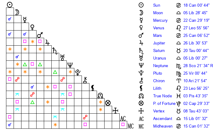 Moon | 5 Libra 22 | 16 Capricorn 59 | 11 Libra 21 |