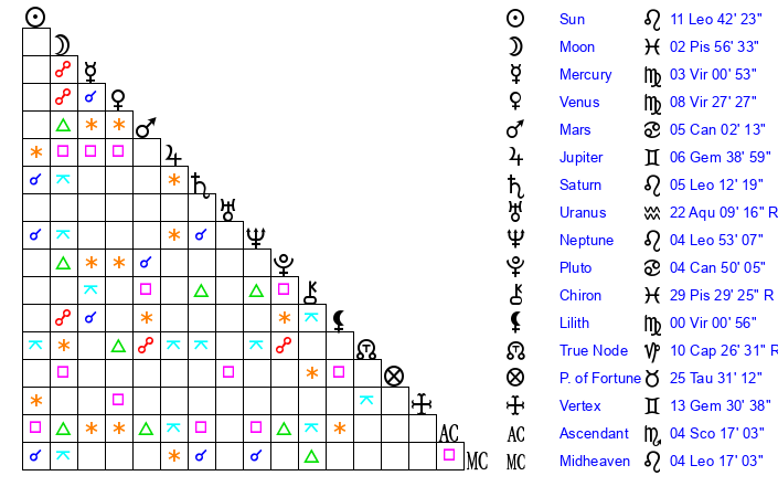 | Moon | 2 Pisces 52 | 17 Sagittarius 34 | 11 Aquarius 45 |