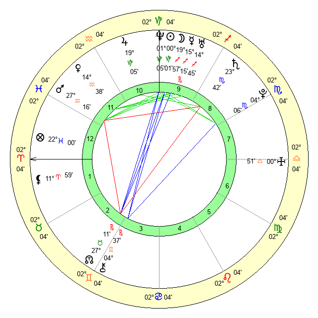 | Saturn | 23 Scorpio 59 | 25 Pisces 33 | 27 Scorpio 23 |