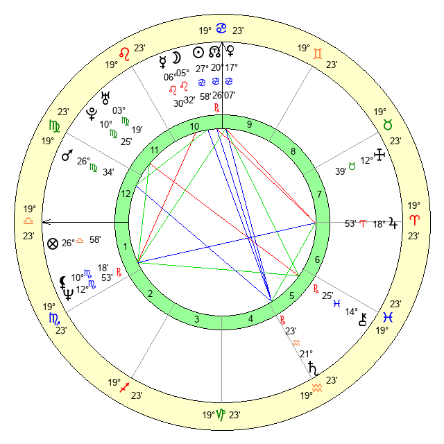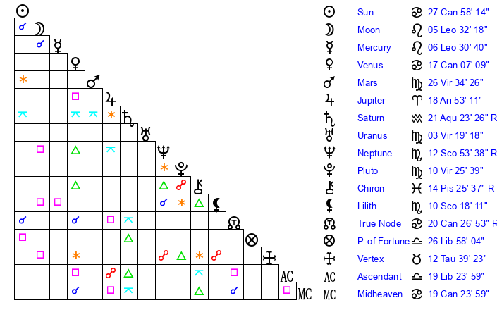 Moon | 5 Leo 27 | 14 Gemini 41 | 7 Scorpio 57 |