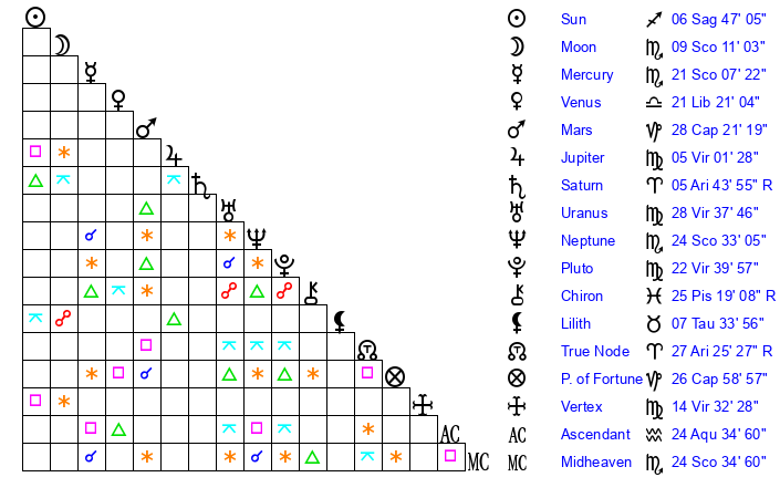 Moon | 9 Scorpio 19 | 20 Scorpio 24 | 12 Sagittarius 56 |
