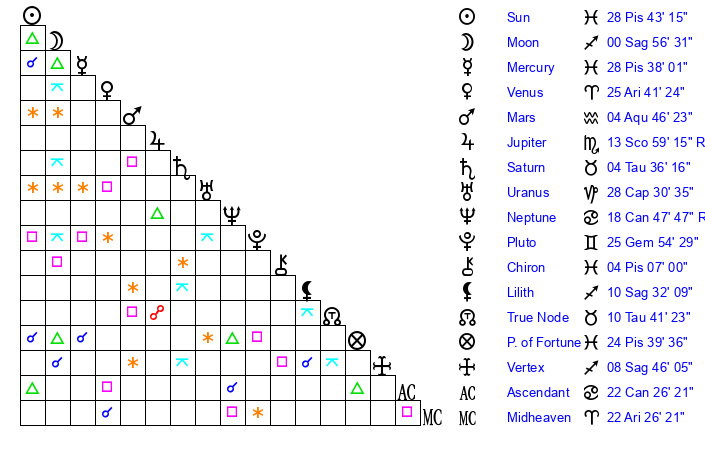 Sun | 28 Pisces 43 | 0 Aries 5 | 18 Cancer 58 |