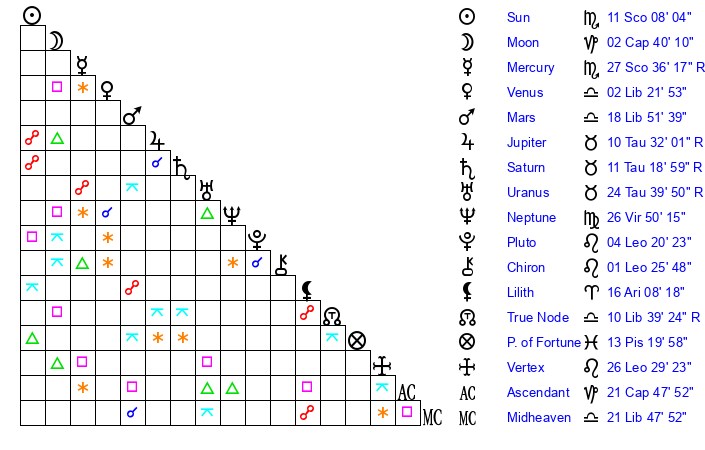 | Mercury | 27 Scorpio 36 | 4 Sagittarius 33 | 18 Aquarius 30 |