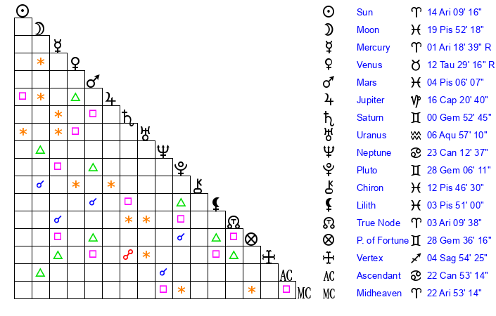 Moon | 19 Pisces 51 | 8 Cancer 10 | 22 Aries 3 |