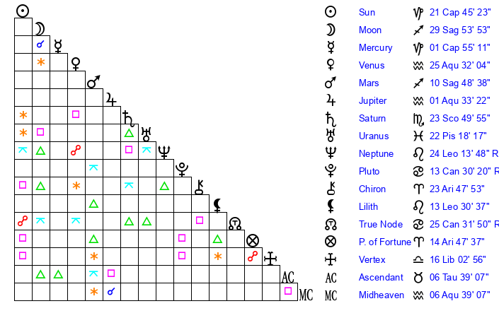 | Sun | 21 Capricorn 46 | 22 Capricorn 45 | 0 Taurus 50 |