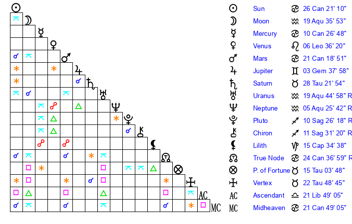 Sun | 26 Cancer 21 | 26 Cancer 19 | 20 Leo 16 |