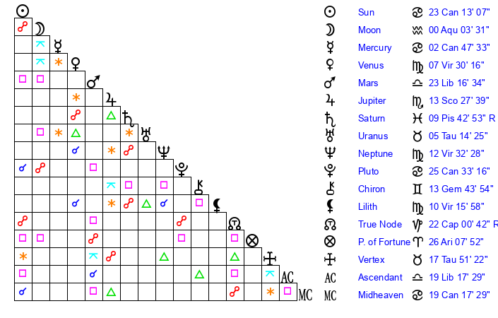 | Pluto | 25 Cancer 33 | 2 Aquarius 46 | 27 Cancer 21 |