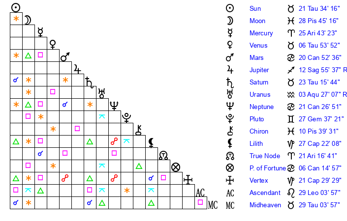 Sun | 21 Taurus 34 | 22 Taurus 13 | 9 Virgo 49 |