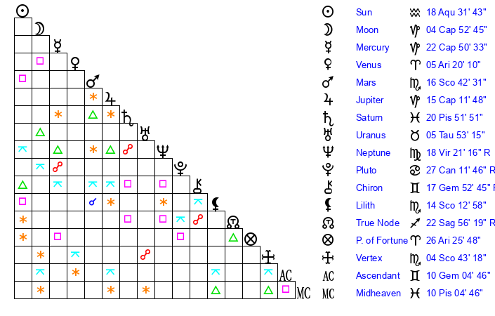 | Sun | 18 Aquarius 31 | 19 Aquarius 10 | 15 Taurus 44 |