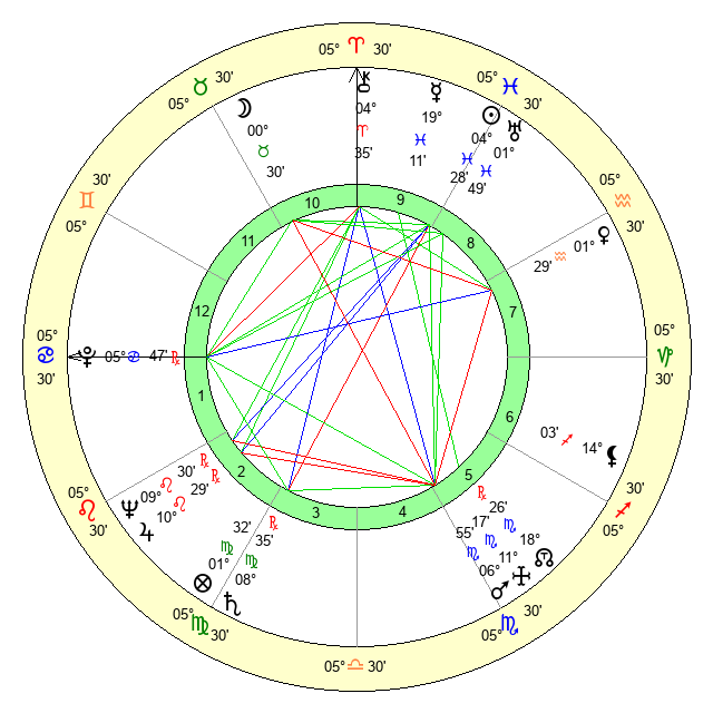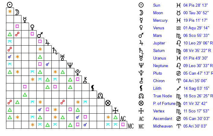 | Sun | 4 Pisces 28 | 6 Pisces 0 | 17 Gemini 14 |