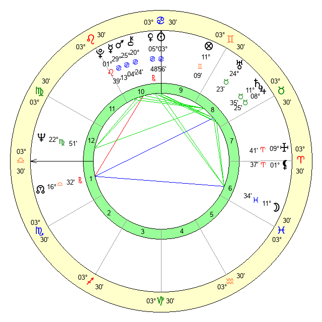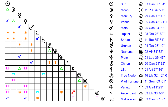 | Moon | 11 Pisces 36 | 8 Cancer 1 | 18 Aries 20 |