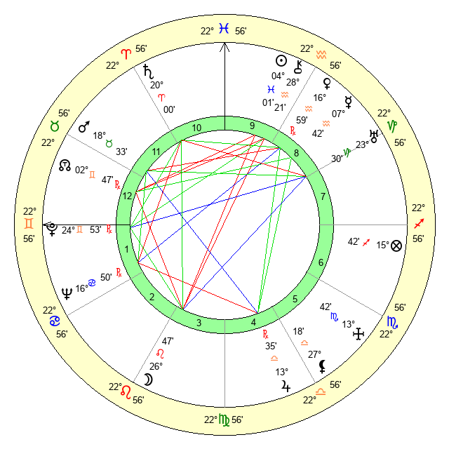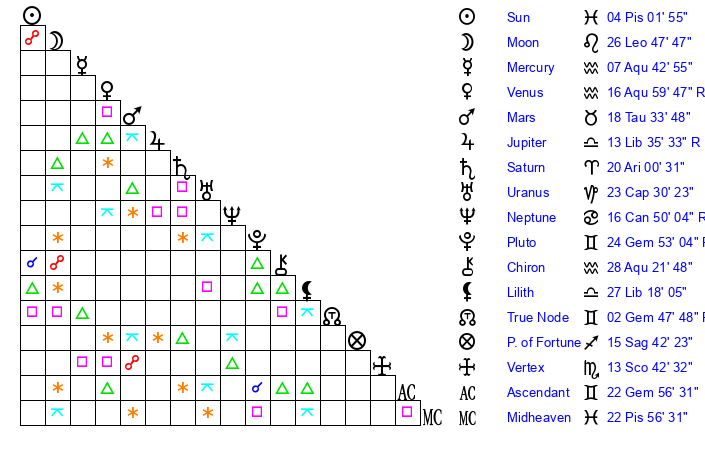 | Sun | 4 Pisces 2 | 5 Pisces 9 | 26 Gemini 22 |