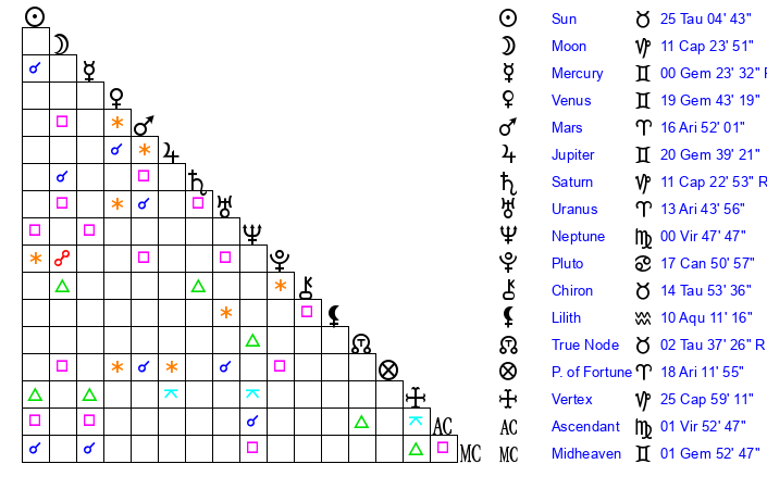 | Moon | 11 Capricorn 20 | 10 Capricorn 50 | 23 Gemini 57 |