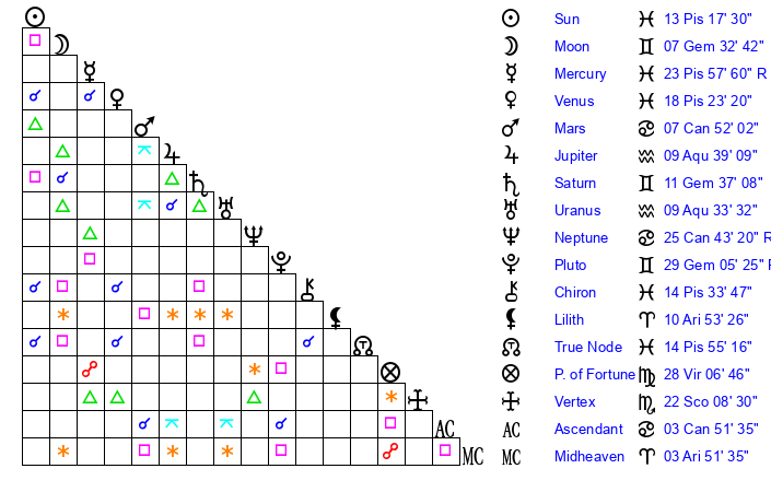 | Saturn | 12 Gemini 18 | 21 Pisces 4 | 23 Gemini 38 |