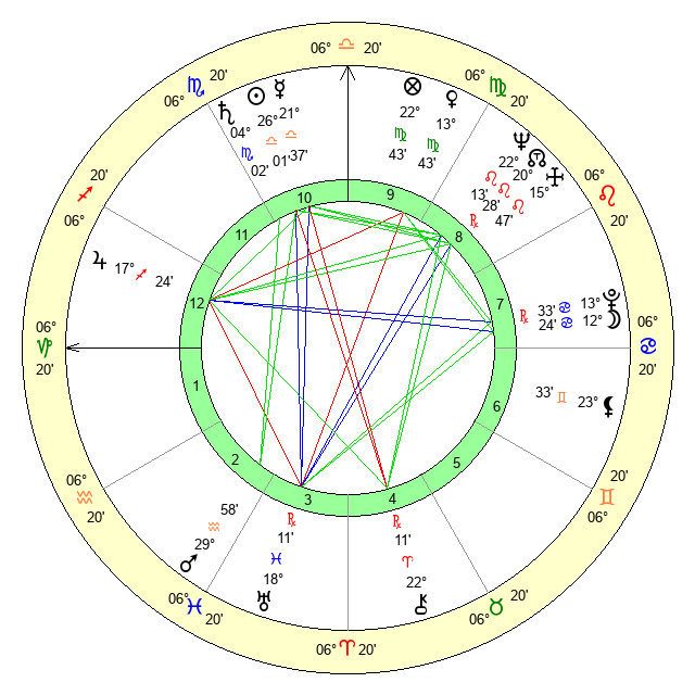 | Saturn | 4 Scorpio 34 | 26 Pisces 21 | 14 Scorpio 20 |