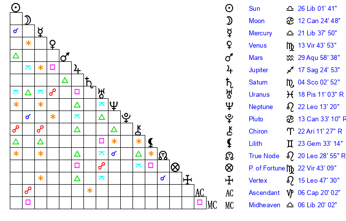 | Saturn | 4 Scorpio 34 | 26 Pisces 21 | 14 Scorpio 20 |