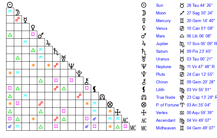 | Sun | 28 Taurus 44 | 29 Taurus 56 | 24 Leo 48 |