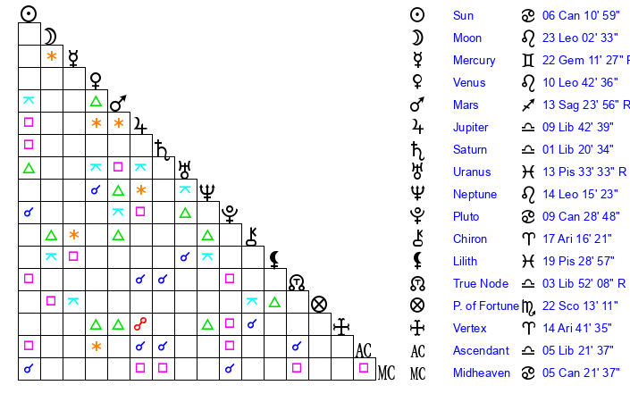 | Mercury | 22 Gemini 11 | 2 Leo 25 | 27 Libra 33 |