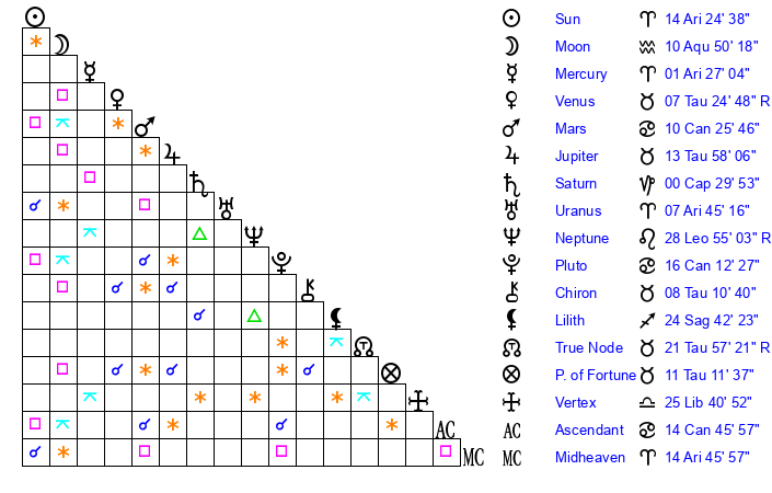 | Pluto | 16 Cancer 13 | 3 Aquarius 36 | 17 Cancer 54 |