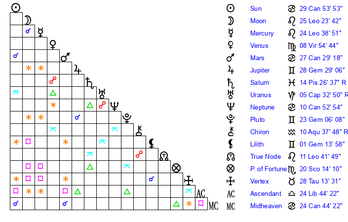 | Mercury | 24 Leo 39 | 14 Leo 21 | 15 Sagittarius 27 |