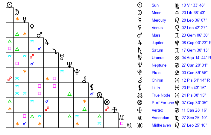 | Sun | 10 Virgo 33 | 11 Virgo 27 | 2 Capricorn 18 |