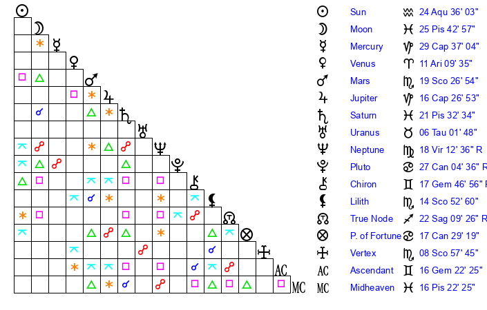 | Sun | 24 Aquarius 35 | 25 Aquarius 15 | 21 Taurus 31 |