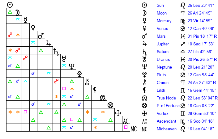 | Sun | 26 Leo 24 | 26 Leo 58 | 6 Sagittarius 13 |