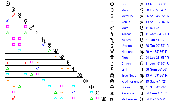| Sun | 13 Aquarius 14 | 14 Aquarius 6 | 5 Taurus 49 |