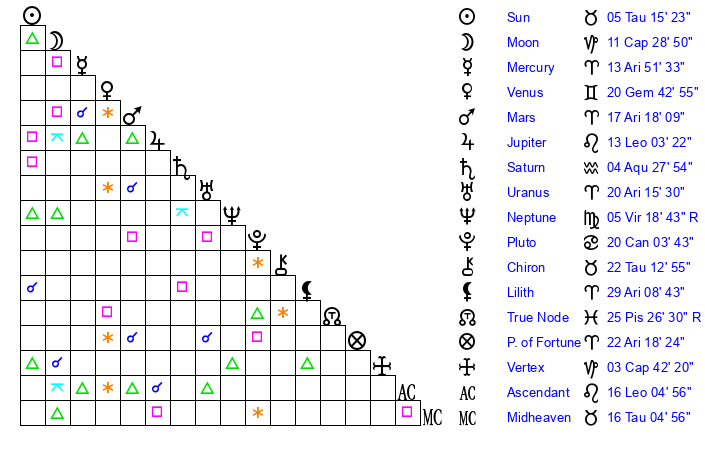 | Moon | 11 Capricorn 31 | 6 Aries 0 | 27 Taurus 41 |