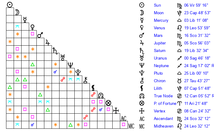 | Saturn | 19 Libra 54 | 29 Pisces 59 | 24 Libra 46 |