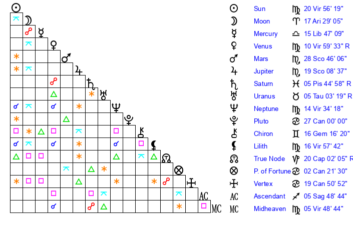 | Neptune | 14 Virgo 34 | 0 Aries 59 | 16 Virgo 45 |