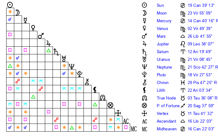 | Mercury | 14 Cancer 40 | 14 Leo 23 | 28 Virgo 21 |