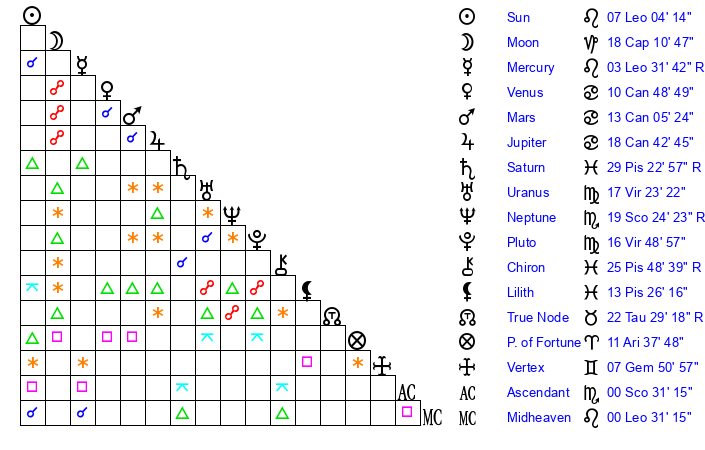Moon | 18 Capricorn 3 | 17 Libra 55 | 12 Pisces 29 |