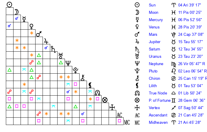 | Moon | 10 Pisces 52 | 14 Aquarius 24 | 7 Aries 46 |