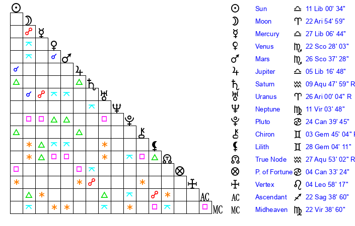 | Sun | 11 Libra 0 | 11 Libra 43 | 13 Capricorn 40 |