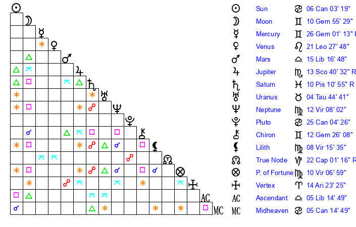 | Sun | 6 Cancer 3 | 7 Cancer 15 | 2 Libra 40 |